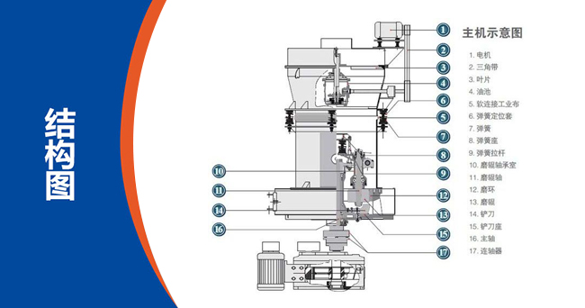 鋁礦石磨粉機內部結構比較簡單,主要由主機、電機、鼓風機、分析機、管道裝置等幾部分組成,其中主機作為該設備的主要部件,又包括了磨輥、磨環(huán)、鏟刀、進風蝸殼、機架、罩殼等。